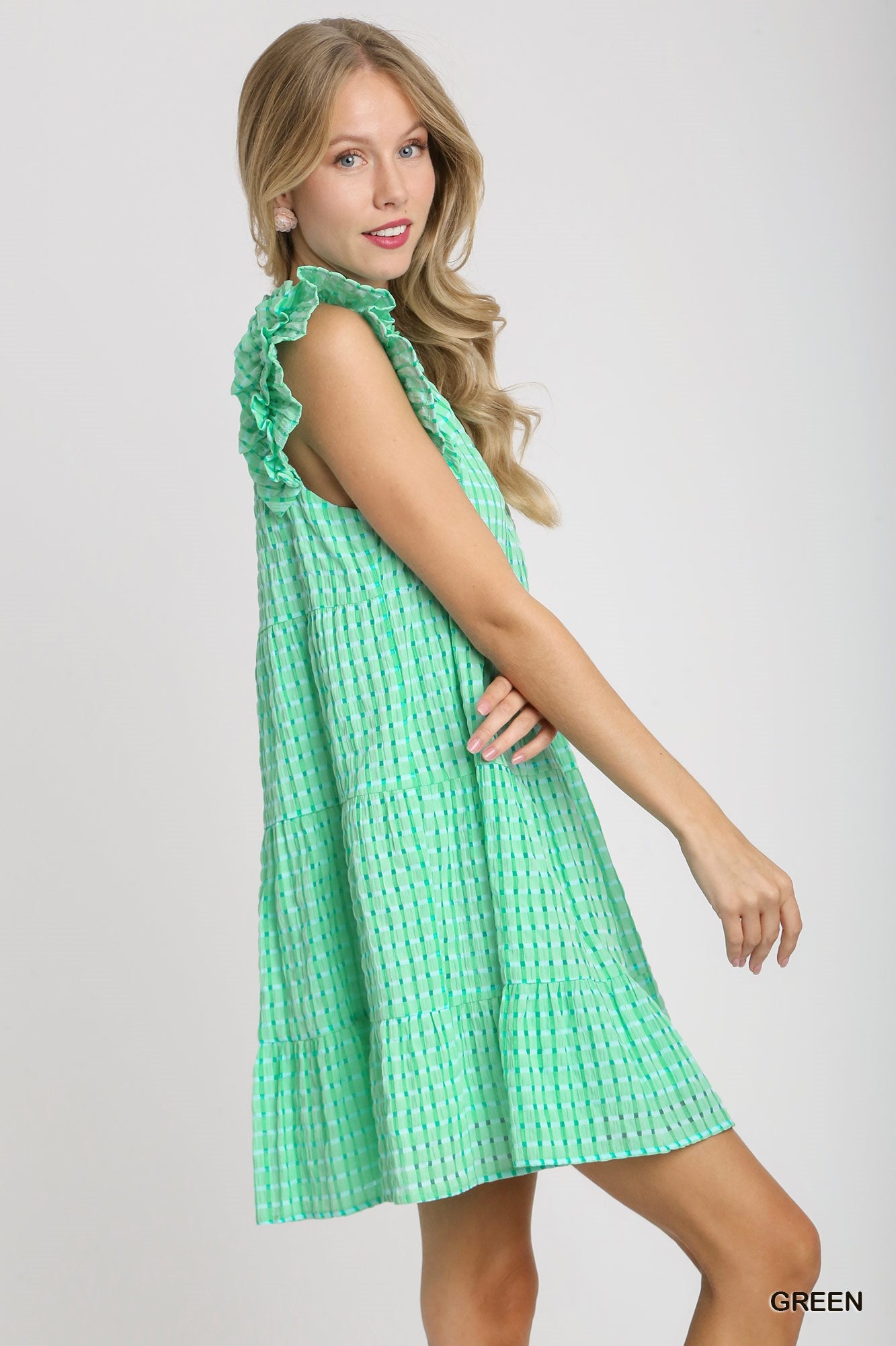 Step into fun with the Checkered Seersucker Mini Dress! This A-line tiered dress features ruffle sleeves and a checkered pattern. Lined for comfort, its lightweight blend of polyester and cotton keeps you cool and fresh on warm days.