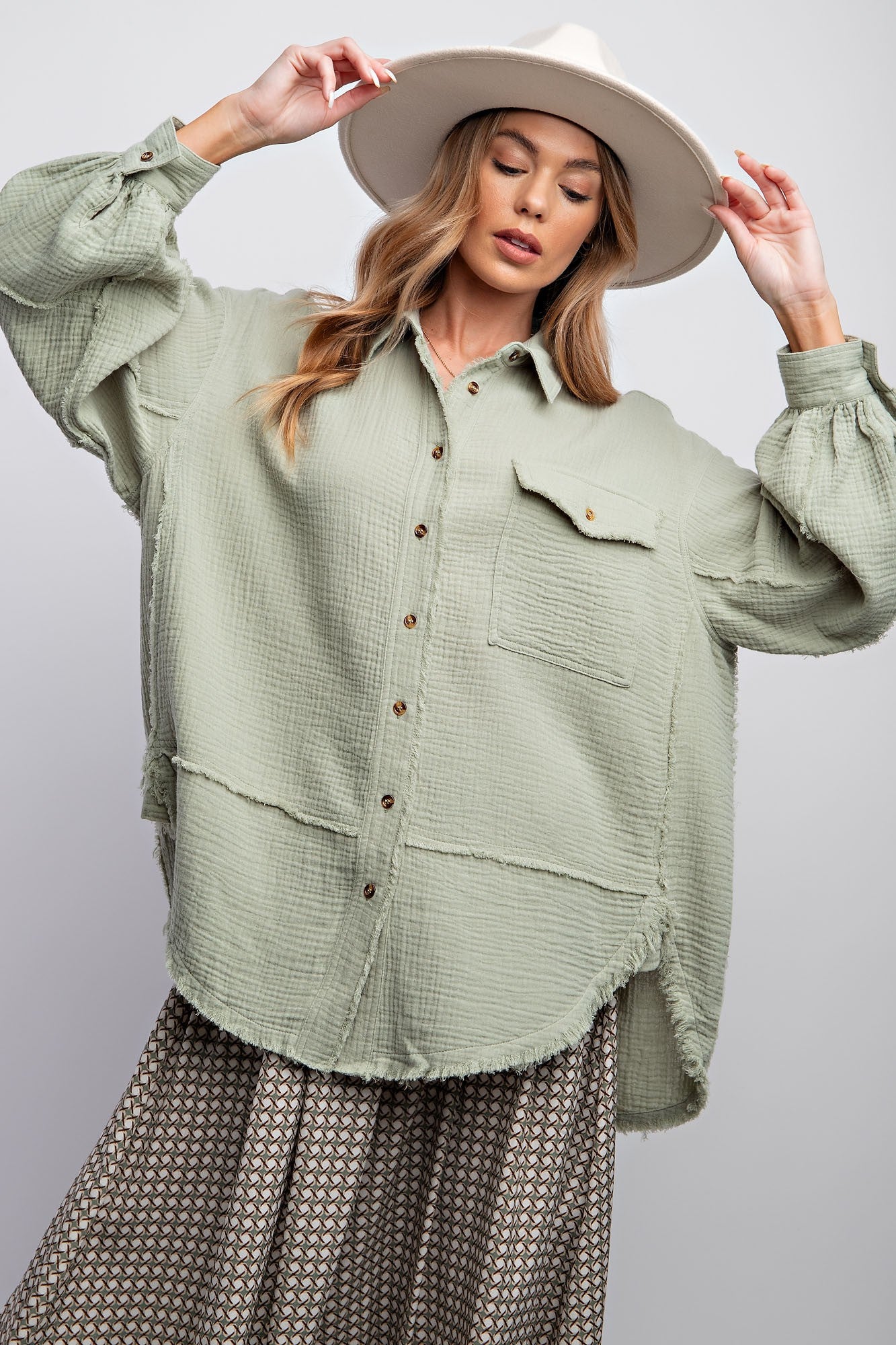 This cotton gauze shirt features balloon sleeves with buttoned cuffs, a curved and raw hemline, a button down front, and a chest flap pocket. It also has a loose fit and boxy silhouette for a comfortable and relaxed look.