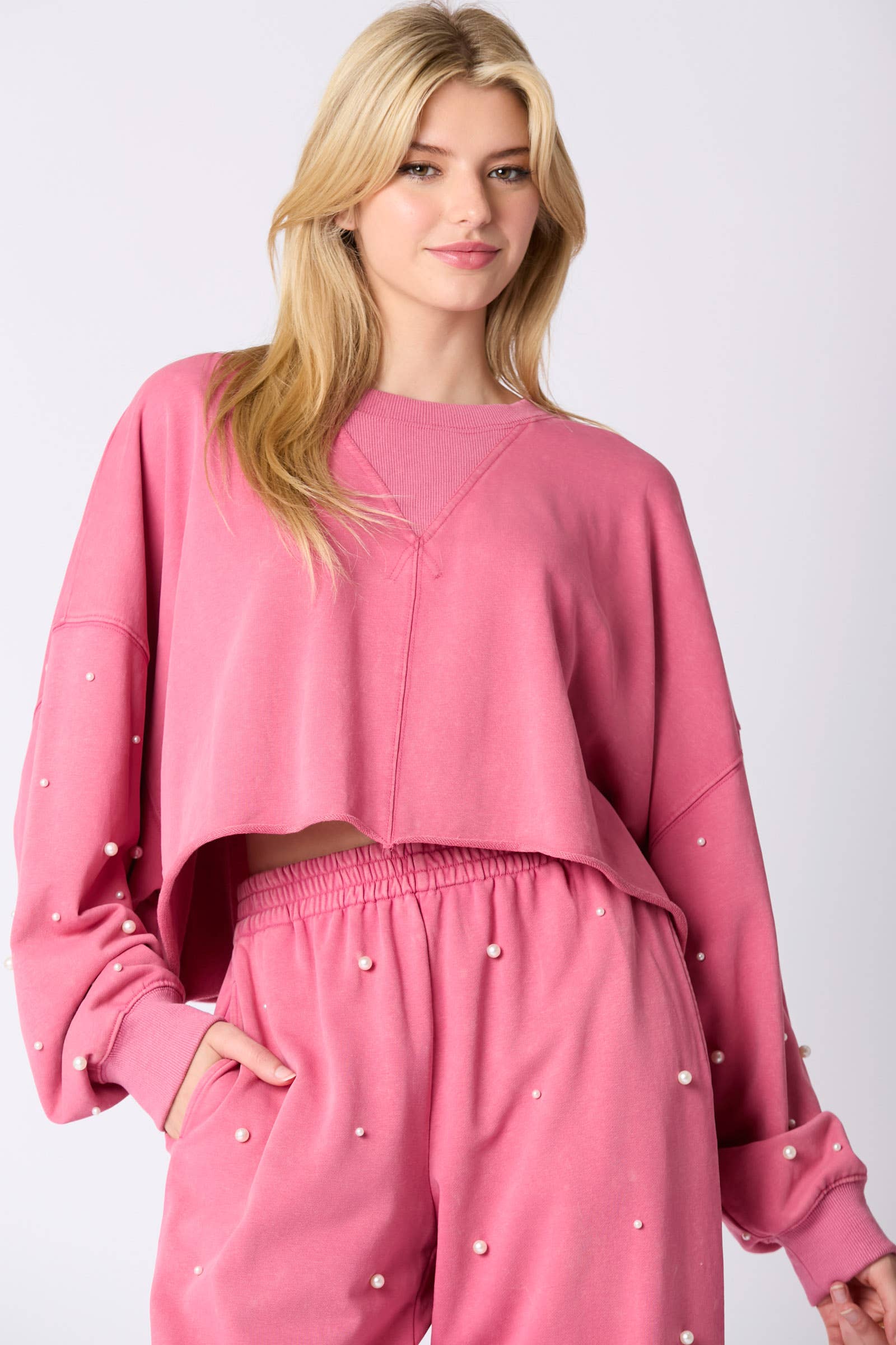 Mineral Washed Pearl Embellished Cropped Top - Sleeves have pearl embellishments -