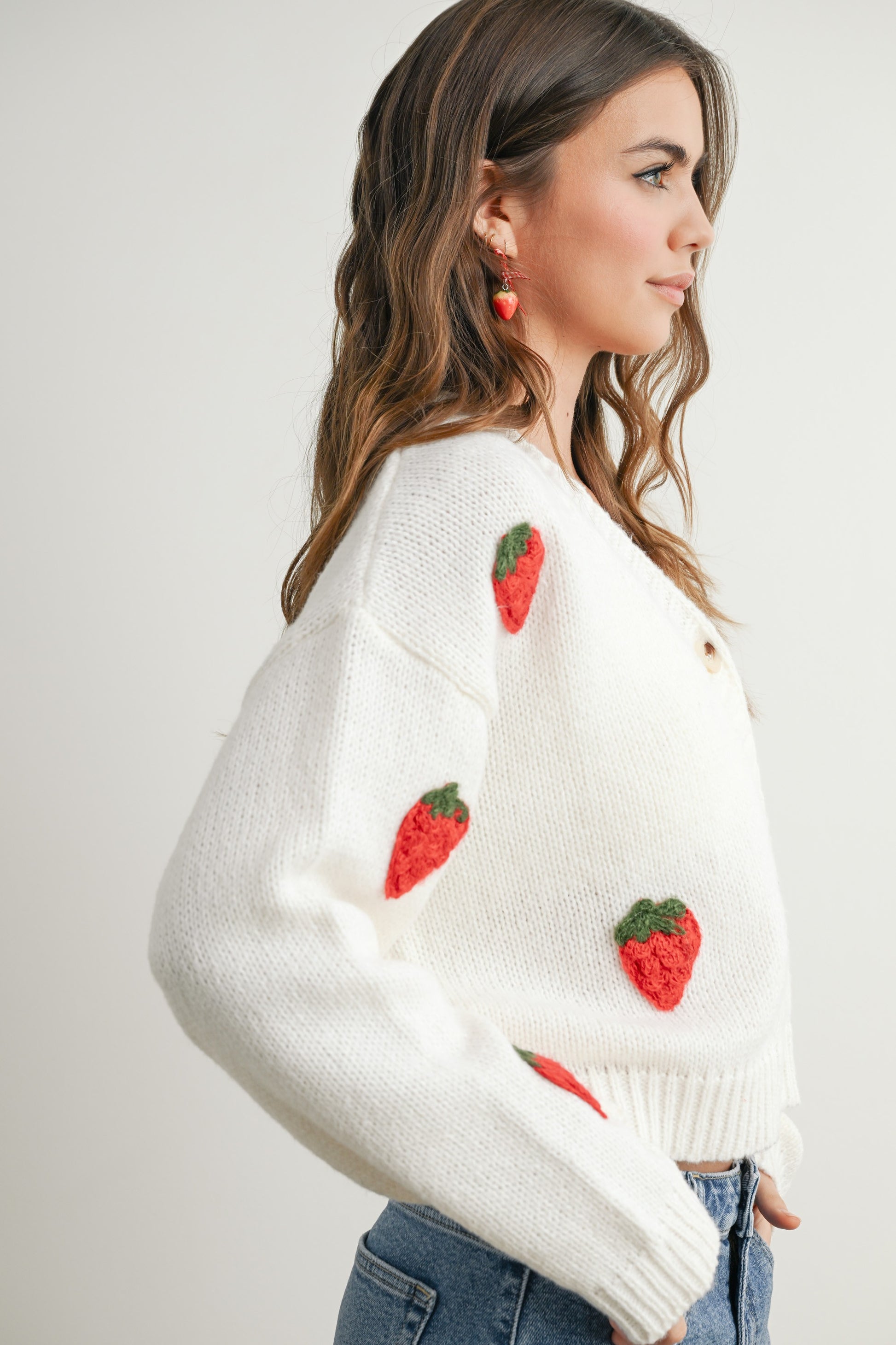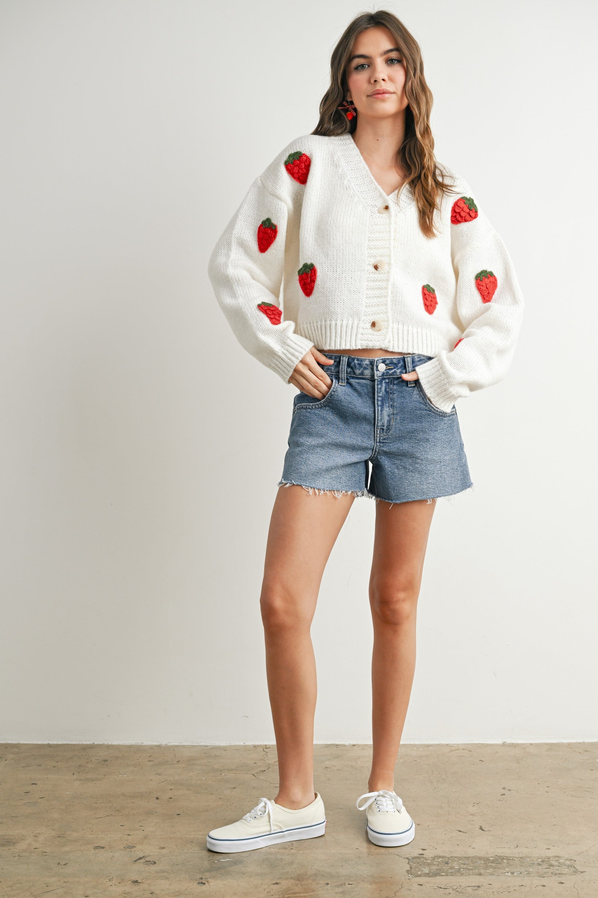 Elevate your wardrobe with our delightful Strawberry Embroidered Cropped Cardigan, a charming blend of style and comfort. This soft, lightweight cardigan features an eye-catching strawberry embroidery that adds a playful touch to any outfit. The cropped length is perfect for layering over your favorite dresses or high-waisted jeans, creating a flattering silhouette that's both trendy and timeless.